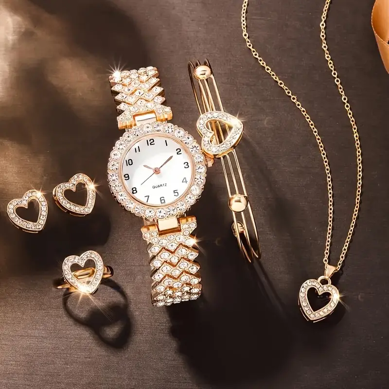 ساعة معصم فاخرة مرصعة بالراين الكوارتز باللون الذهبي ومجموعة مجوهرات