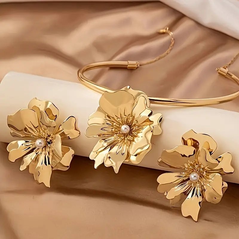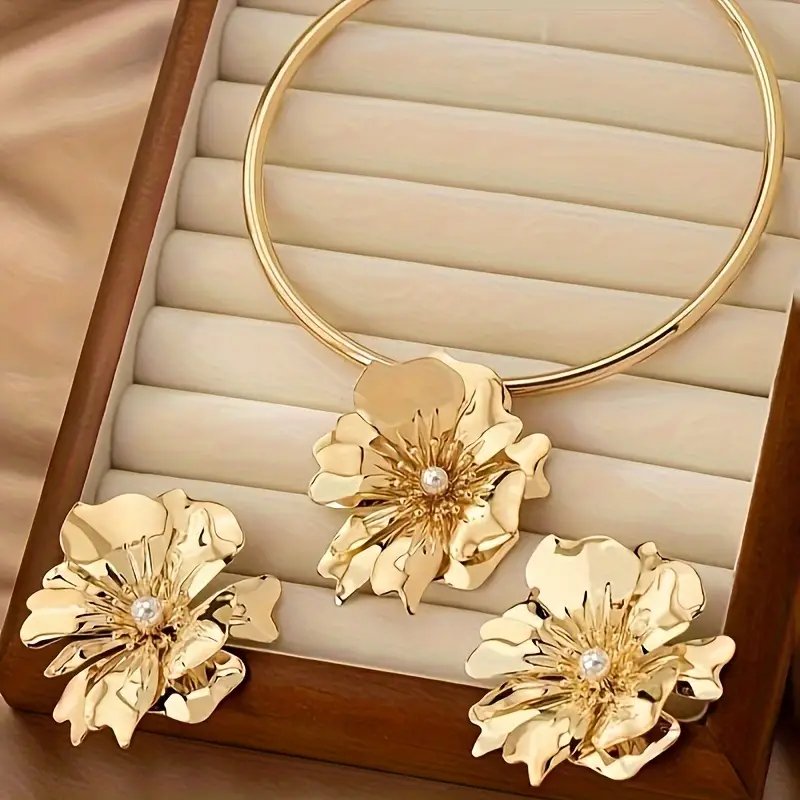 طقم مجوهرات فاخر بلون ذهبي مع لمسات من اللؤلؤ الأكريليك – يشمل شوكير وأقراط، مثالي للعطلات أو الزي العادي