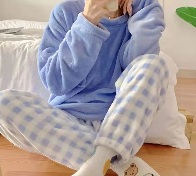 طقم نوم نسائي بأكمام طويلة مكون من قطعتين للشتاء صوفية بيجامة نوم راقي ومريحة ودافئة بنطلون مخطط بطريقة انيقة تفصيل كوري للشتاء أزرق
