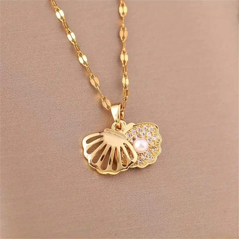 قلادة قوقعة موضة بتفاصيل لؤلؤ صناعي، سلسلة من الفولاذ المقاوم للصدأ مطلية بالذهب عيار 18، تفاصيل من الزركون الكبي، تصميم مجوف ساحر للمجوهرات